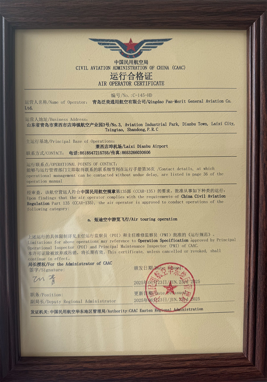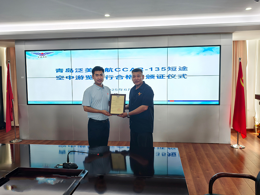 2025 年 6 月 27 日,民航青島安全監(jiān)督管理局向青島泛美通航正式頒發(fā)CCAR-135 短途空中游覽運(yùn)行合格證。頒證儀式上,青島監(jiān)管局領(lǐng)導(dǎo)及飛標(biāo)處、適航維修等部門從安全運(yùn)行規(guī)范、法規(guī)執(zhí)行要求、人員資質(zhì)管理、機(jī)坪地面安全管控、乘客權(quán)益保障、航空器日常維護(hù)標(biāo)準(zhǔn)、關(guān)鍵部件檢查流程等維度提出系統(tǒng)性監(jiān)管要求。青島泛美通航明確表示,將嚴(yán)格落實(shí)規(guī)章標(biāo)準(zhǔn)與手冊規(guī)范,始終將安全運(yùn)行置于核心地位,建立全流程安全管控體系。